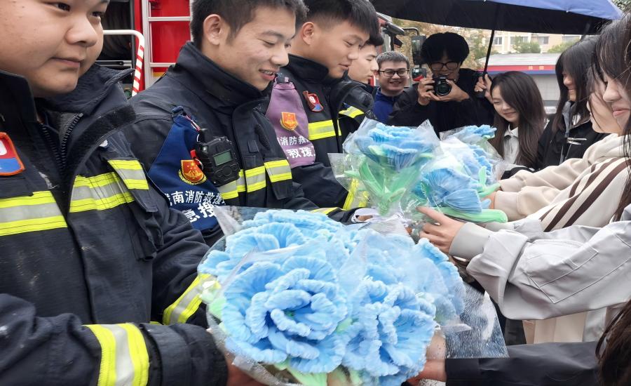 活动最后,学生们将自己亲手制作的代表“火焰蓝”的蓝色花束赠予消防救援队,以质朴的方式表达对他们无私奉献精神的敬佩与感激之情。