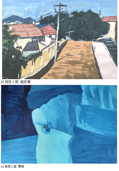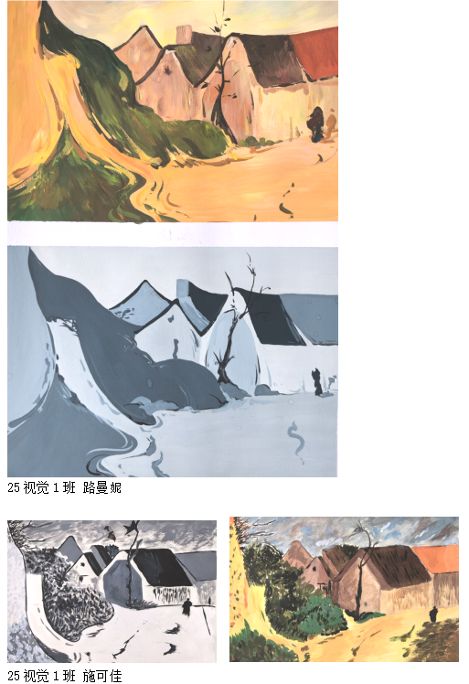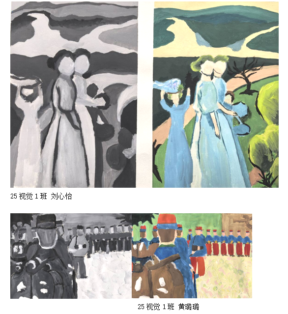 展示作业涵盖多个核心学习模块,全面覆盖色彩基础能力的培养维度:其一为黑白灰归纳作业,同学们以单色阶为创作载体,通过对物象黑白灰层次的精准拆解与重组,探索明度与形态的内在关联,夯实视觉表达的基础能力;其二是色彩归纳作业,聚焦色彩的色相、明度、纯度三大核心属性,通过对自然或生活场景的提炼与概括,学习色彩搭配的平衡与和谐之美,锤炼色彩取舍与重组的创作思维;其三为大师作品色彩转换作业,同学们以经典艺术作品为参照,深入剖析大师的色彩运用逻辑与情感表达手法,通过复刻与再创作的方式,实现对色彩语言的深度理解与灵活转化;此外,结合当下数字设计趋势,今年还特别设计了色彩智能应用教学模块,探索AI等智能工具与色彩创作的融合路径,展现传统色彩基础与现代技术结合的创新可能。