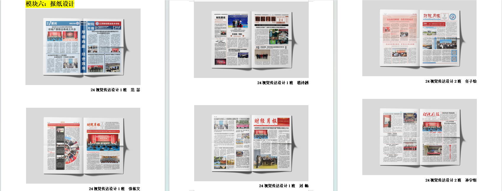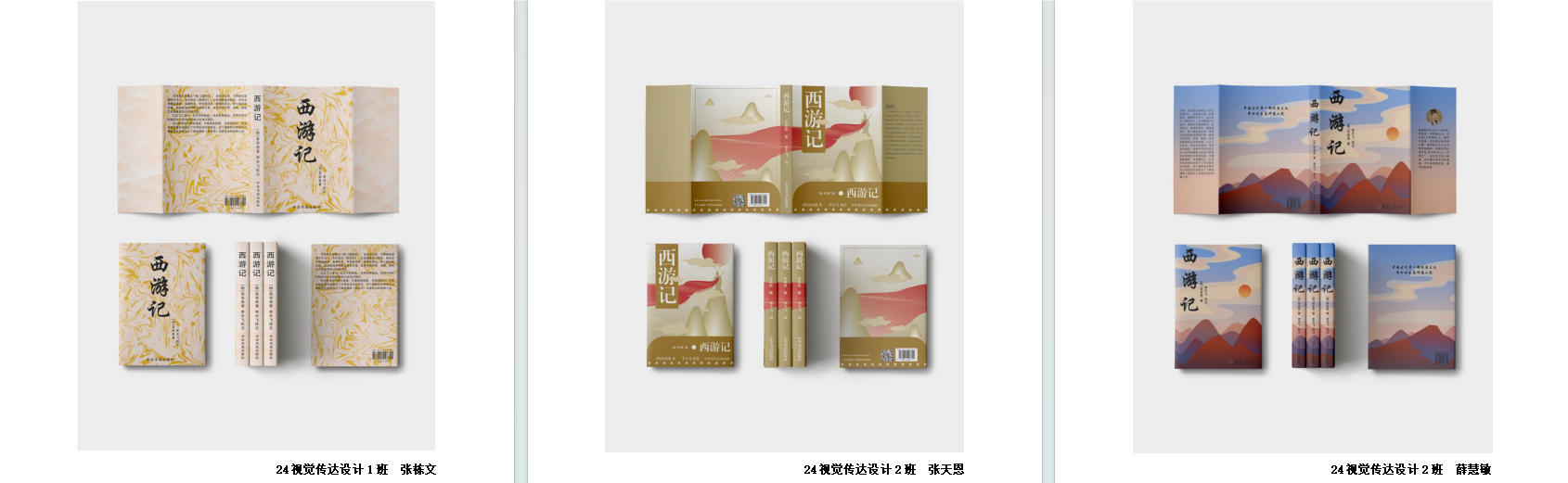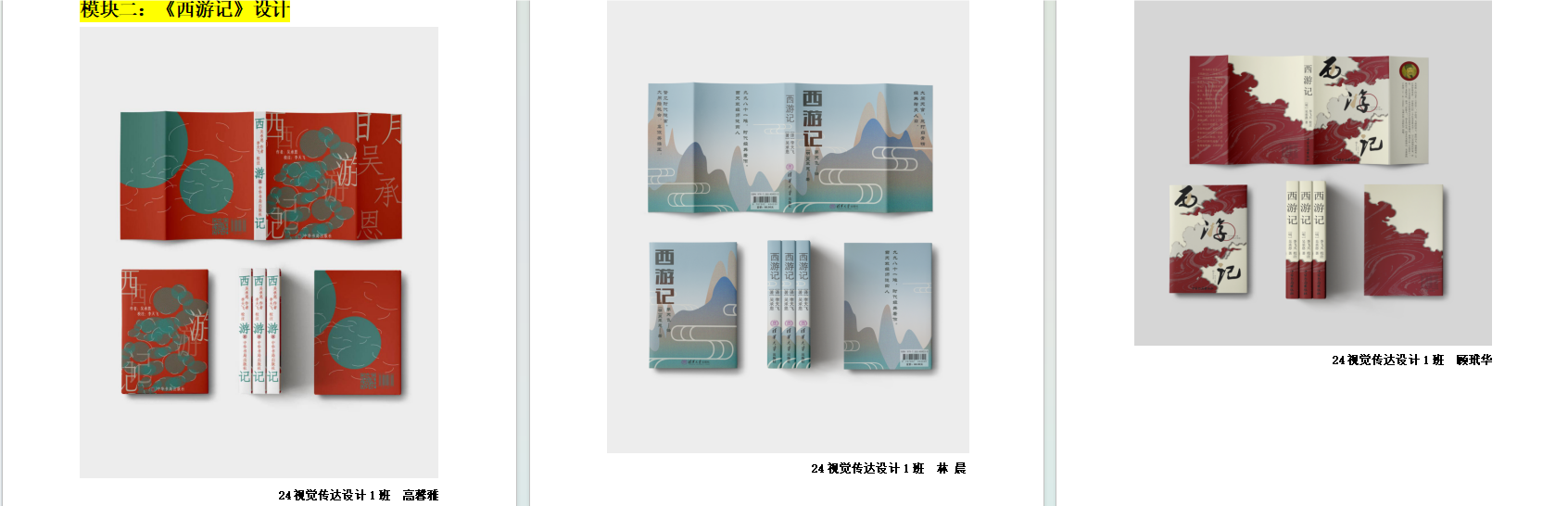从作品模块构成来看,内容涵盖《飞鸟集》《西游记》等文学书籍设计、《装饰画》类教科书设计、《美食》杂志设计、企业宣传画册及报纸设计等多种类型,能够较好回应不同媒介属性与传播需求。整体训练路径清晰完整,体现较强的系统性与递进性,但个别作品在色调统一、信息层级梳理及阅读秩序的清晰度方面仍有提升空间。