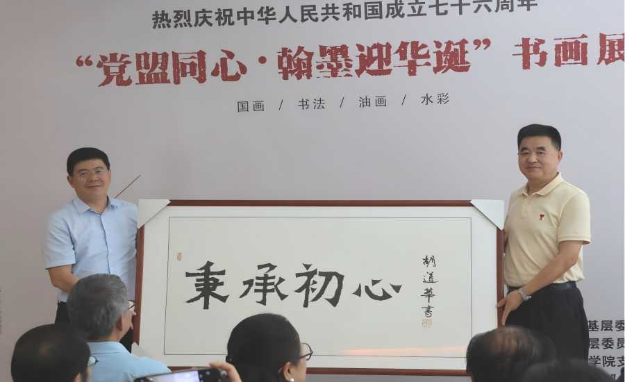 仪式上,毕丰书代表民盟市委向学校党委赠送中国著名书法家胡道华先生题写的“秉承初心”巨幅力作;笔锋所至,初心如磐,全场掌声如潮。