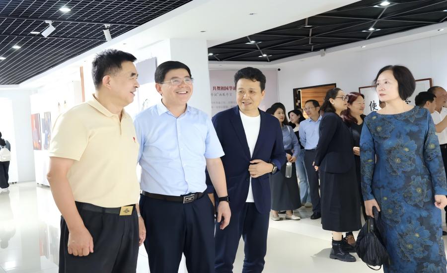 随后,领导嘉宾与师生代表移步至“移动美术馆”——知行楼201展厅参观。80余幅书画精品或雄浑豪放,或清新隽永;《山河无恙》《同心铸梦》等力作,把对党、对祖国的深情凝于尺素。翰墨丹青,礼赞新中国七十六载峥嵘岁月;笔走龙蛇,书写新时代千里江山。一幅幅山水寄情,一幅幅花鸟言志,一幅幅铁画银钩,尽展党盟携手、师生同心的磅礴气象。