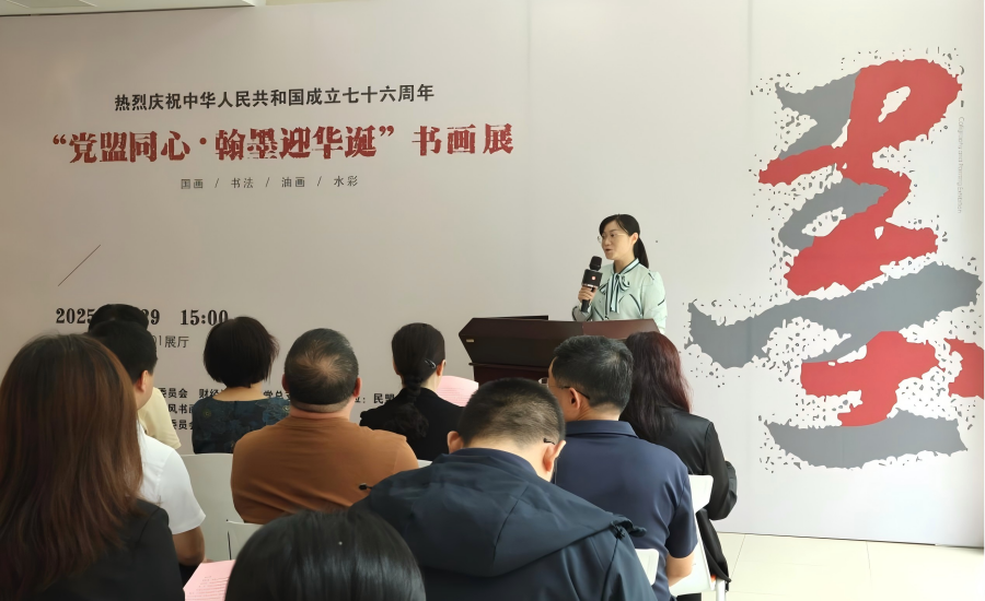 闫超栋代表学校党委致辞。他指出,七十六年风雨兼程,中国共产党团结带领全国各族人民写下从站起来、富起来到强起来的壮丽史诗;六十一载弦歌不辍,江苏财院以周恩来精神为炬火,把中华优秀传统文化熔铸于立德树人全过程。此次与民盟市委会联袂办展,既是向祖国华诞献上的一份文化厚礼,更是校地“党盟共建”走深走实的生动注脚。