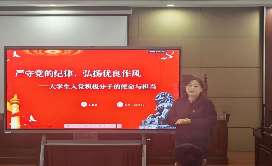 学院副院长王真真以“严守党的纪律,弘扬优良作风——大学生入党积极分子的使命与担当”为主题,围绕党的纪律内涵、优良作风传承,结合大学生成长实际,深入阐释了入党积极分子需坚守的纪律底线与应肩负的时代使命,强调要将纪律意识融入学业与实践,以优良作风践行责任担当。