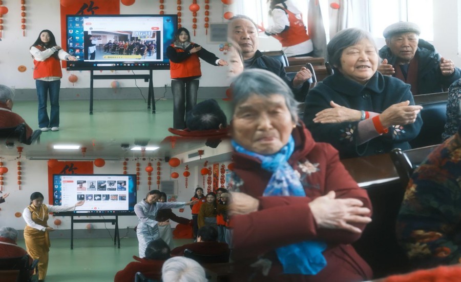 以艺传情,点亮银龄生活。活动在热烈温馨的氛围中拉开帷幕。志愿者们精心筹备的文艺汇演轮番上演:藏族舞蹈《锅庄舞》以优美的舞姿展现了浓郁的民族风情;京剧《桃花村》节目妙趣横生;大合唱《小美满》、手势舞《桃花朵朵开》则以温情的旋律传递出对长辈们的真挚祝福。随后,志愿者们化身“领操员”,带领老人们做起《清肺操》,在一招一式间舒展筋骨,现场其乐融融。
